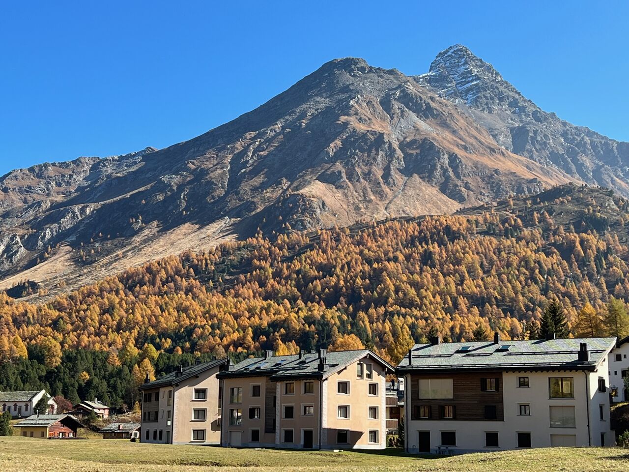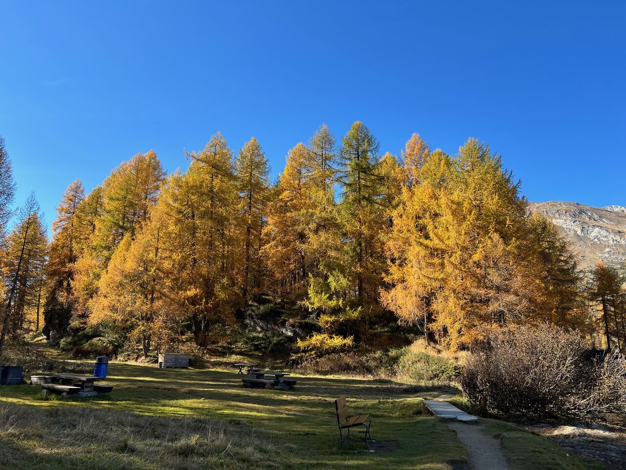 エンガディンの黄葉もピークを迎えています。カラマツが金色に輝いて大変美しいです。これほど広範囲で黄葉が広がる谷はスイスの中でもそうないです。あまりの綺麗さにどこを歩こうか迷ってしまいます。