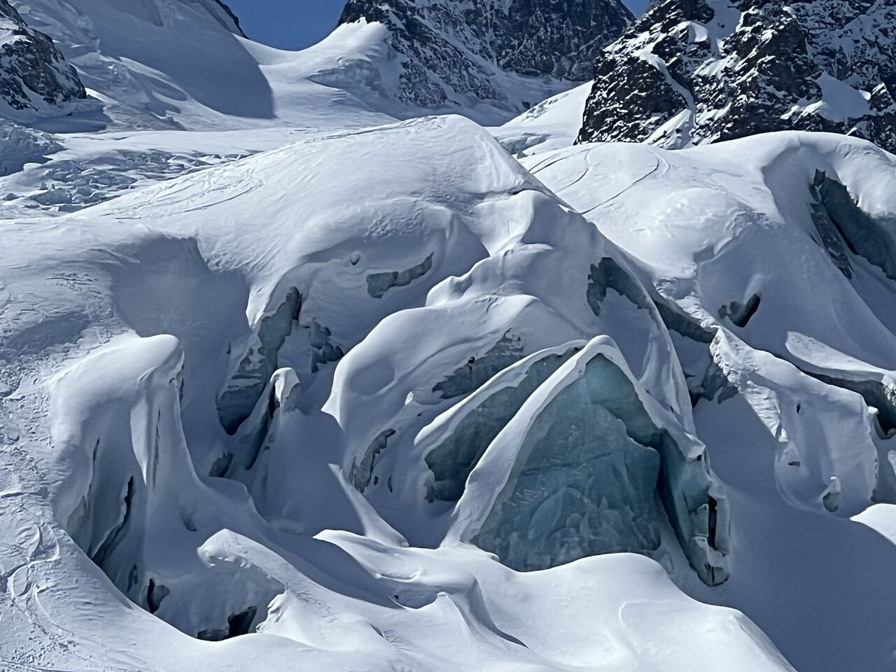 4年ぶりくらいに氷河スキーに行きました。ディアヴォレッツァから出発し、ペルス氷河とモルテラッチ氷河の上を滑り、モルテラッチ駅までの8キロコースです。ベルニナ山系の美しい山々と迫力の氷河をまじかに見ながら滑走できる素晴らしいコースです。雪崩コントロールはしていますが、圧雪は入っていませんので、オフピステになります。上級者オンリーの限られたコースになりますが、足前に自信のある方には是非挑戦して欲しいですね。日本では味わえない体験ができます。